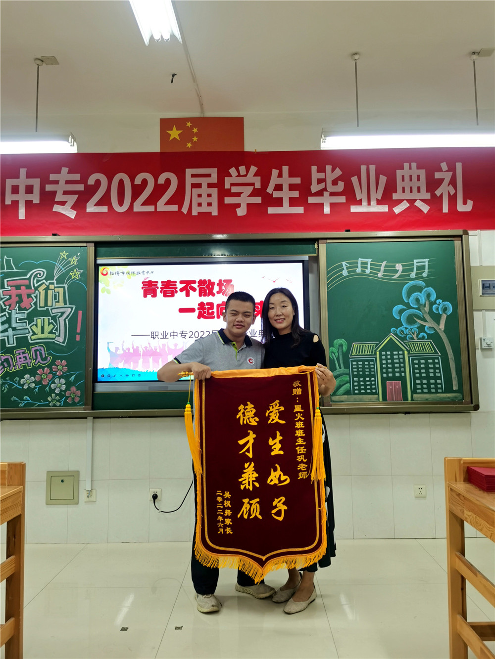 學(xué)生代表向班主任敬送題有“愛(ài)生如子,德才兼顧”的錦旗,并合影留念。學(xué)生代表發(fā)言,感恩母校三年的培育,感謝老師三年的教誨,感激同學(xué)三年的陪伴,將帶著對(duì)母校、老師、同學(xué)的那份眷念、不舍,勇敢地去迎接嶄新的生活。
