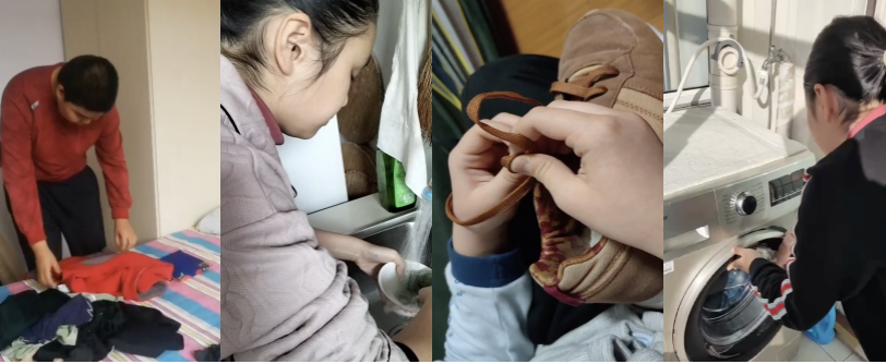 在生活適應(yīng)、勞動(dòng)技能教師的指導(dǎo)下,培智低年級(jí)段同學(xué)從實(shí)際生活出發(fā),展示了洗臉、刷牙等自理技能,實(shí)現(xiàn)了自助、自立,增強(qiáng)了自我成就感。中年級(jí)段同學(xué)借助課上學(xué)習(xí)的本領(lǐng),幫父母打掃衛(wèi)生、整理物品、洗衣服、疊衣服、系鞋帶等,用自己質(zhì)樸的行動(dòng)回饋父母無(wú)私的愛(ài)。高年級(jí)段同學(xué)化身“美食小達(dá)人”,走進(jìn)廚房,大展才藝,親自動(dòng)手體驗(yàn)做飯的樂(lè)趣。和面、搟面、包水餃,洗菜、切菜、炒菜……大家干勁十足,品嘗到甜蜜勞動(dòng)果實(shí)的同時(shí),收獲了成長(zhǎng)的幸福。活動(dòng)中,學(xué)生不僅幫父母切實(shí)減輕了家務(wù)負(fù)擔(dān),也鍛煉了自己的身體和本領(lǐng),為居家學(xué)習(xí)創(chuàng)造了舒適溫馨的環(huán)境。