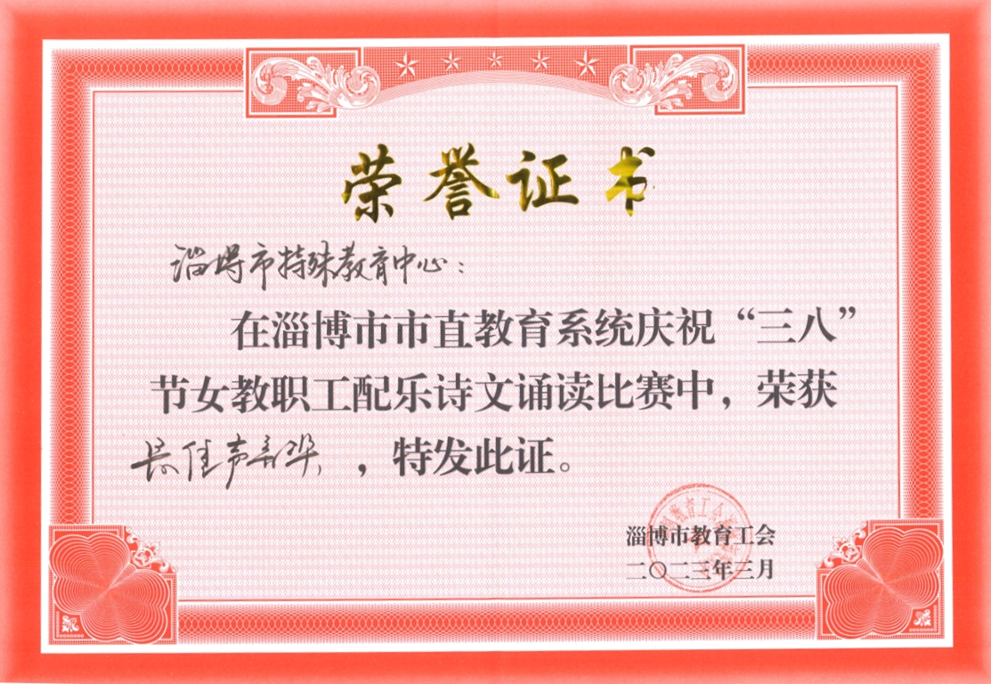 揚(yáng)清風(fēng)正氣,展巾幗風(fēng)采。3月8日上午,淄博市特教中心代表隊(duì)參加了市直教育系統(tǒng)慶“三八”女教職工配樂詩文誦讀活動,榮獲最佳聲音獎。