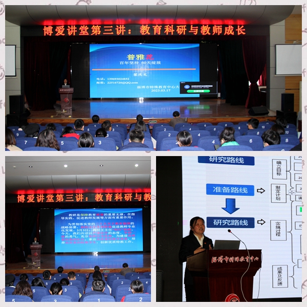 研有道,學無涯;教學是果,科研是根。為進一步提高教師的教科研能力,促進教師專業(yè)化成長,扎實做好科研過程管理,推動我校教科研工作開展。3月17日,學校組織第3期“博愛講堂”專題講座,圍繞“教育科研與教師成長”進行專題培訓,翟慶文老師主講,科研處副主任邢會青解讀配套的教科研實施意見,副校長杜建博主持,45歲以下教職工參與此次培訓。