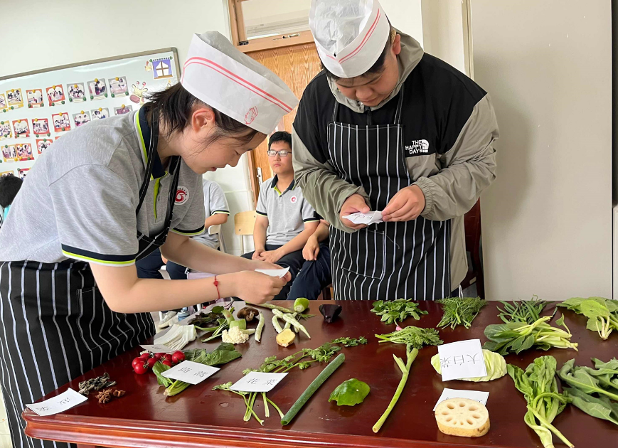 接下來(lái),同學(xué)們馬不停蹄地進(jìn)入了辨食材環(huán)節(jié)。同學(xué)們發(fā)揮自己的聰明才智,分工合作,通過(guò)看、聞等方式,將生活中常見(jiàn)的白菜、菠菜、藕、茴香等蔬菜以及桂皮、八角等調(diào)味品一一貼上標(biāo)簽,考驗(yàn)了大家的合作能力和對(duì)食材特征的熟悉程度。