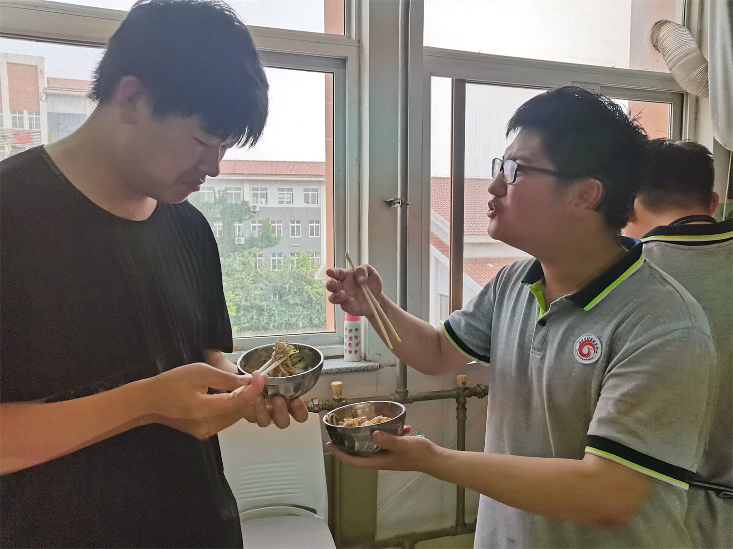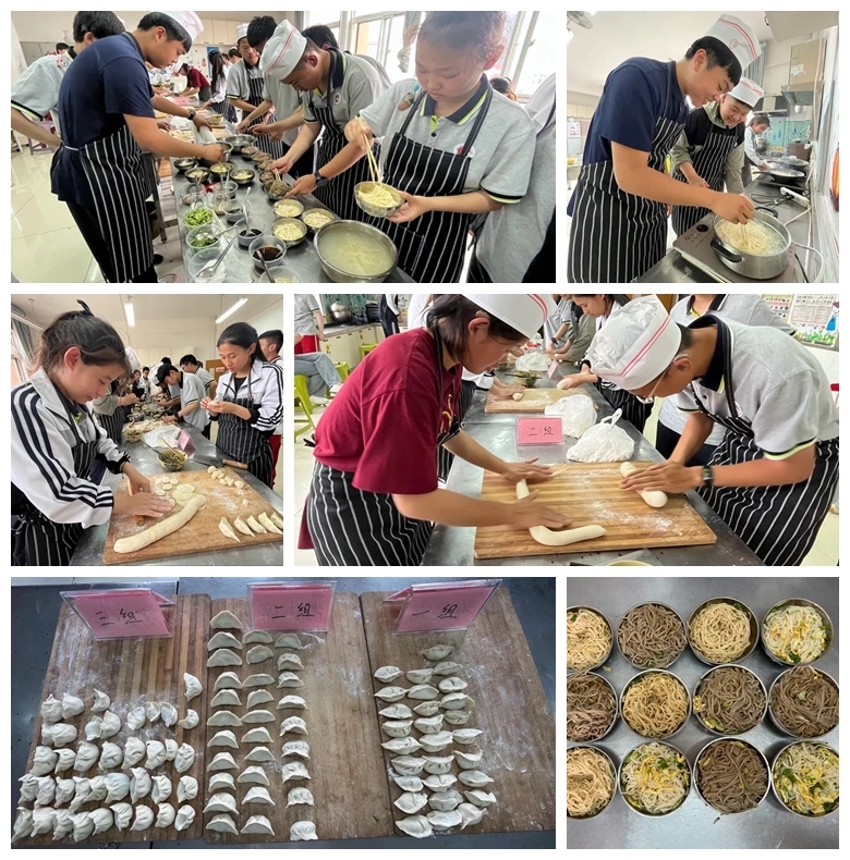 在面食制作環(huán)節(jié),同學(xué)們也是分工明確,配合默契。有的煮面,有的撈面,有的負(fù)責(zé)調(diào)料,一碗碗精致鮮美的面條呈現(xiàn)在大家眼前。與此同時(shí),其他同學(xué)揉面、搟皮、包餃子,動(dòng)作嫻熟、有條不紊,手指翻飛間,一個(gè)個(gè)皮薄餡大的餃子脫手而成,一會(huì)兒便擺滿了桌子。
