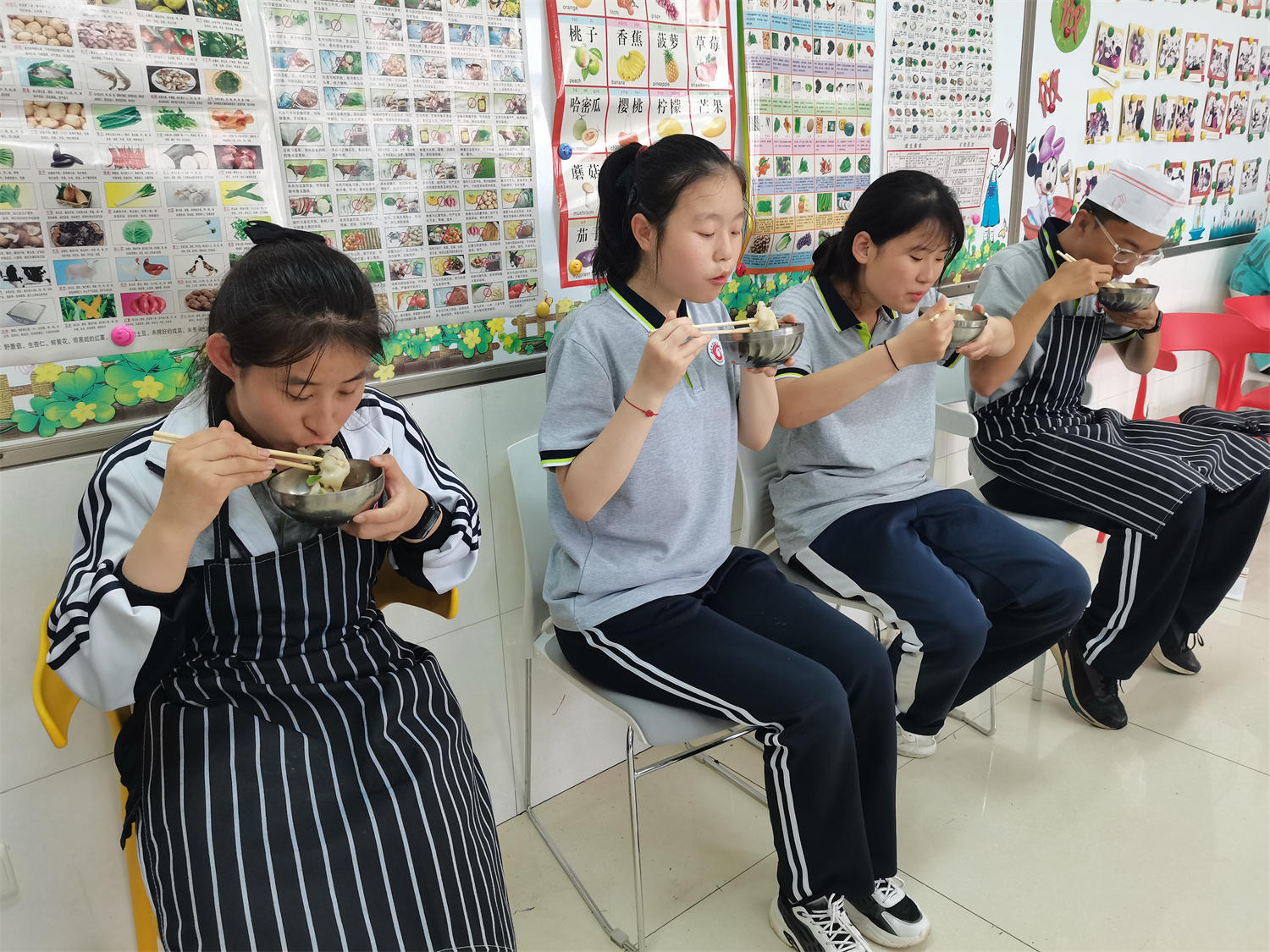 評(píng)委老師根據(jù)各環(huán)節(jié)的綜合表現(xiàn)進(jìn)行了打分,為各班級(jí)頒發(fā)了最佳廚藝、最佳組織、最佳參與獎(jiǎng),并評(píng)出了最佳刀工、最佳花刀、最佳辨物、最佳烹飪獎(jiǎng)各兩名?;顒?dòng)結(jié)束后,同學(xué)們津津有味地吃著自己做的餃子和面條,臉上洋溢著喜悅和自豪,更有說(shuō)不出的快樂(lè)。