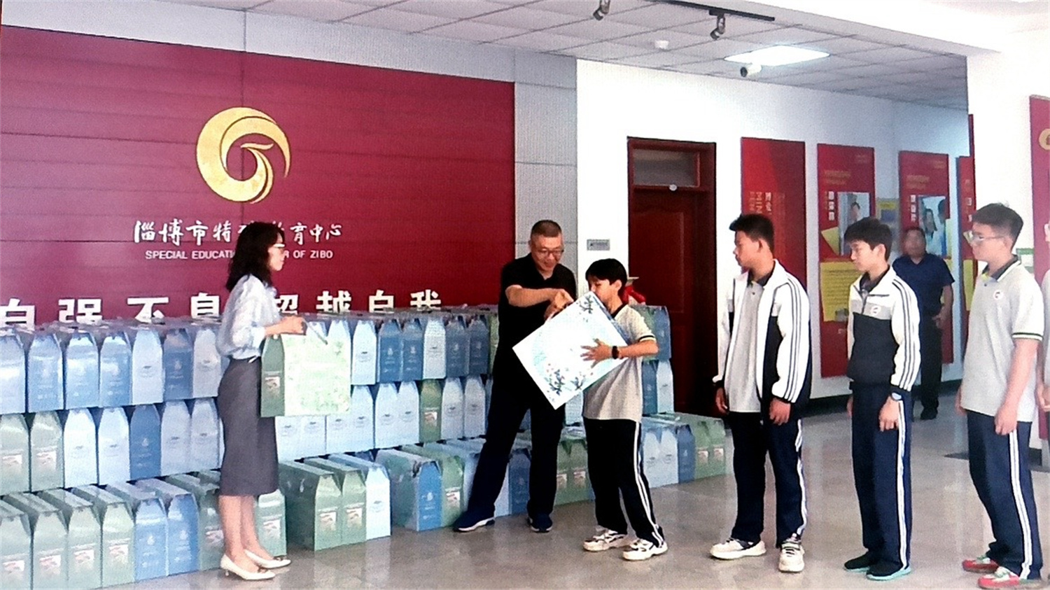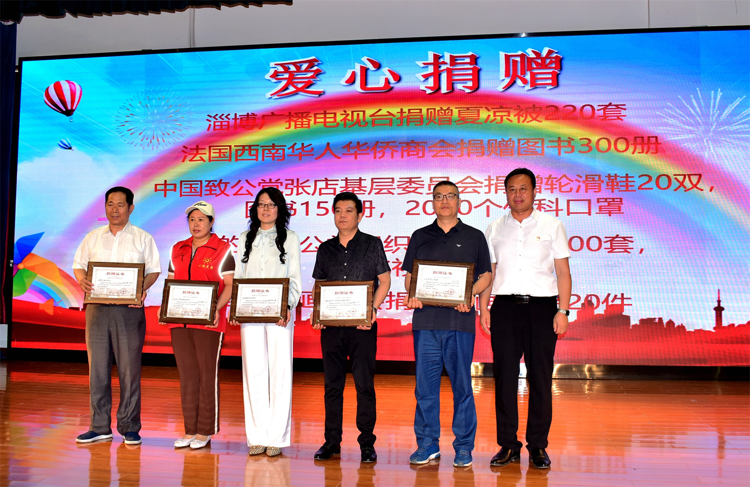市老年書(shū)畫(huà)學(xué)會(huì)市直一分會(huì)的老年書(shū)畫(huà)作家現(xiàn)場(chǎng)為學(xué)生進(jìn)行創(chuàng)作,并為學(xué)校捐贈(zèng)書(shū)畫(huà)作品40余副。市廣播電視臺(tái)為學(xué)生捐贈(zèng)夏涼被200余套。中國(guó)致公黨張店基層委員會(huì)為學(xué)校捐贈(zèng)圖書(shū)150余冊(cè),輪滑鞋20雙、外科口罩2000個(gè)。心的光明公益組織捐贈(zèng)文具1000套,文化衫500件。法國(guó)西南華人華僑商會(huì)為我校捐贈(zèng)圖書(shū)300余冊(cè)……學(xué)校黨委副書(shū)記李善軍為愛(ài)心企業(yè)頒發(fā)了捐贈(zèng)證書(shū)。
