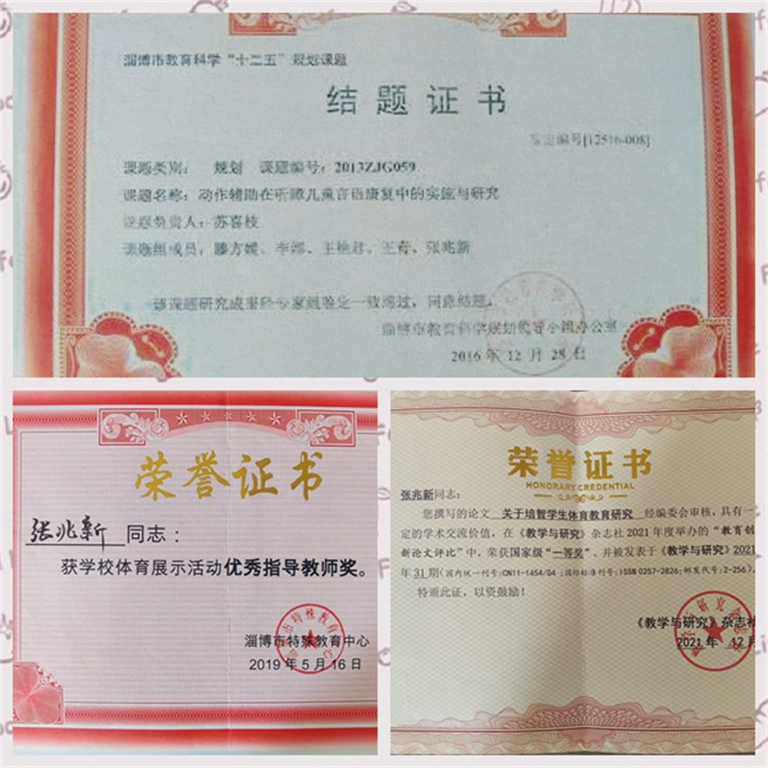 特殊教育的使命就是用心工作,用靈魂喚醒沉睡的靈魂,這也是每一位特教工作者的初心與使命。張老師參加工作以來,曾從事視障教育教學(xué),2012年起到康培部工作,在康復(fù)教育教學(xué)中,注重加強個人自身學(xué)習(xí),先后參加了山東師范大學(xué)研究生班的學(xué)習(xí),中國聾兒康復(fù)研究中心初級康復(fù)師的培訓(xùn)學(xué)習(xí),上海小小虎可視音樂培訓(xùn)與學(xué)習(xí),高級助聽器驗配師的培訓(xùn)與學(xué)習(xí),省殘聯(lián)組織的聾兒聽能管理培訓(xùn)班等,獲得國家高級按摩師、高級助聽器驗配師資格證書。