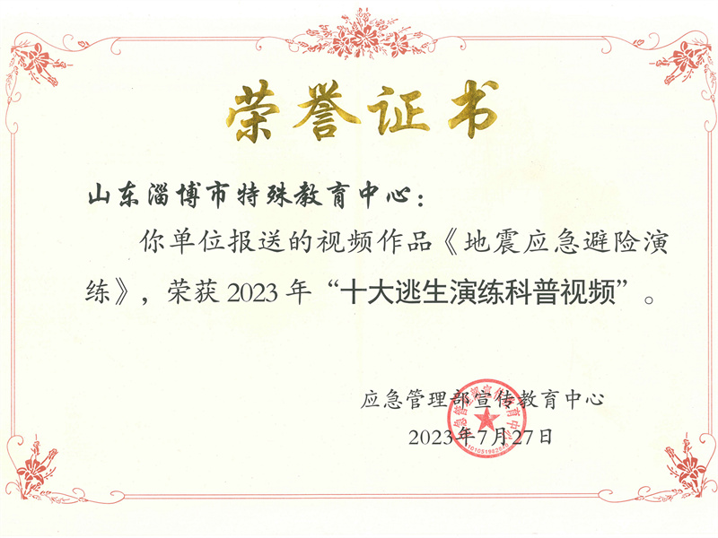 近日,2023年全國“十大逃生演練科普視頻”觀摩交流活動在河北省秦皇島市舉辦,淄博市特教中心精心創(chuàng)作的公益助殘科普視頻《地震應急避險演練》正式入選。