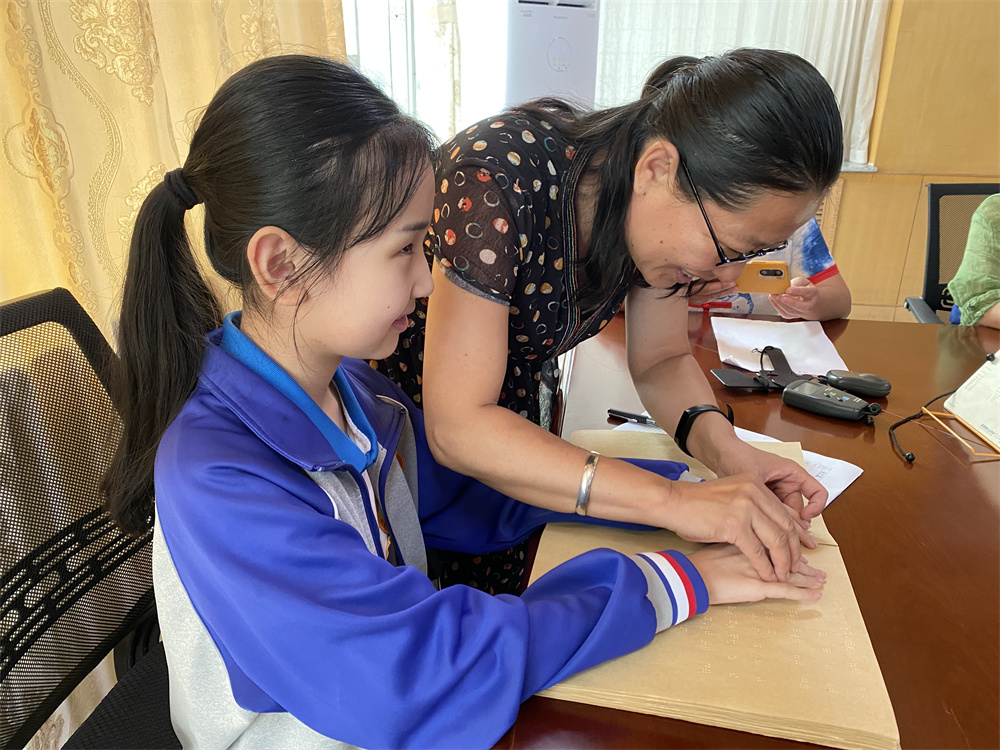 指導(dǎo)團(tuán)隊(duì)首先就俊篪的學(xué)習(xí)狀況、座位安置、課程設(shè)置、無(wú)障礙設(shè)施環(huán)境等問(wèn)題展開調(diào)研。通過(guò)充分訪談俊篪的任課教師、班級(jí)同學(xué)以及家長(zhǎng),了解到俊篪盲文接觸少的問(wèn)題,在對(duì)她進(jìn)行專業(yè)視力評(píng)估的基礎(chǔ)上,建議加強(qiáng)其盲文和信息技術(shù)課程的學(xué)習(xí)。盲文的學(xué)習(xí)是盲生獲取信息的重要渠道,信息技術(shù)的使用則可以幫助他們將學(xué)到的知識(shí)轉(zhuǎn)化為信息交流,一入一出,幫助他們打通社會(huì)交往的障礙。