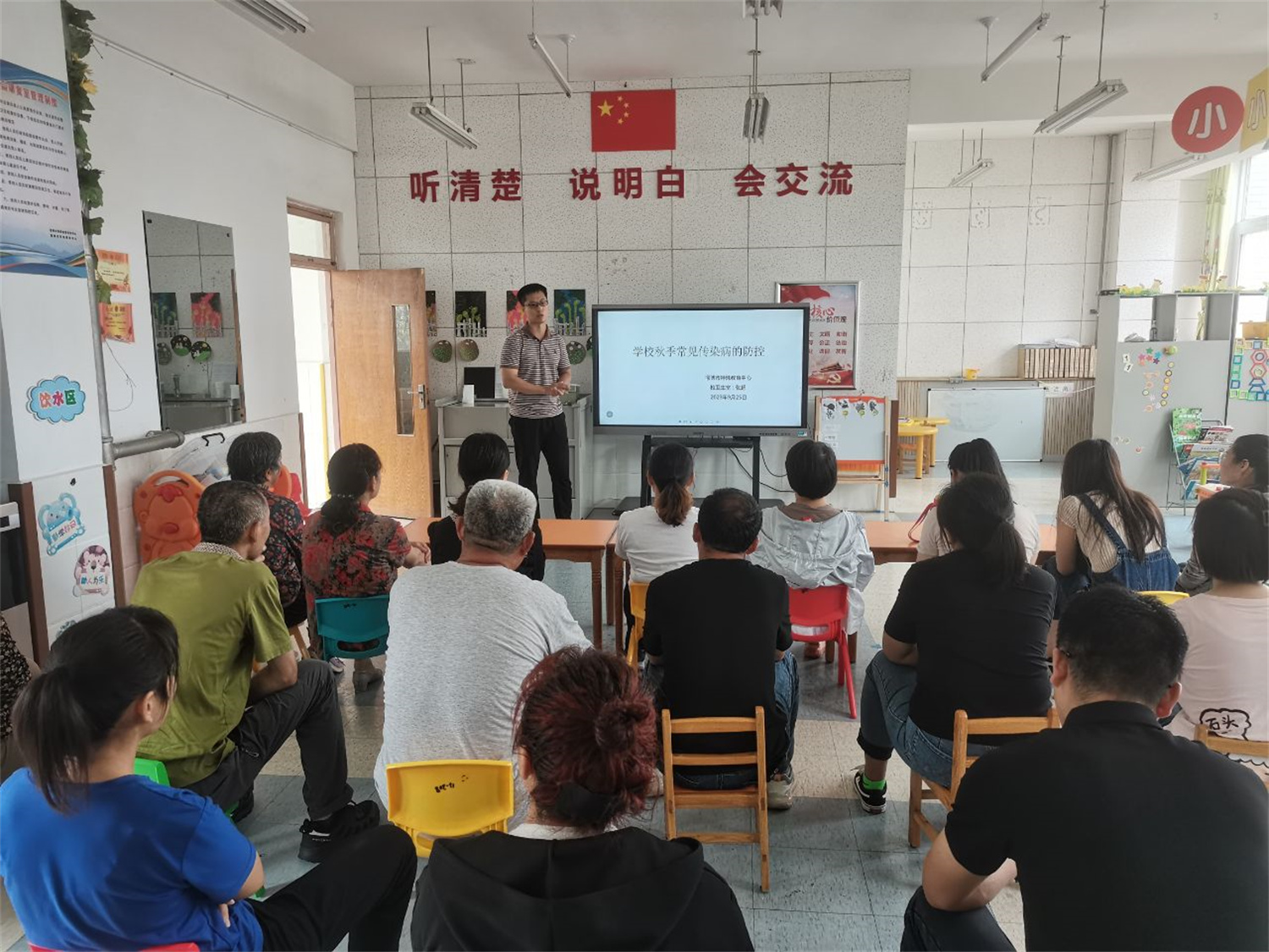校醫(yī)張超首先向大家明確了傳染病的概念,講解了傳染病的流行過程,又向老師及家長(zhǎng)們介紹了秋季學(xué)校中常見傳染病的種類,包括流行性腮腺炎、呼吸道傳染病、腸道傳染病、手足口病等。最后張醫(yī)生重點(diǎn)向大家介紹了各類傳染病尤其是手足口病的預(yù)防措施,并帶領(lǐng)師生練習(xí)了“七步洗手法”。