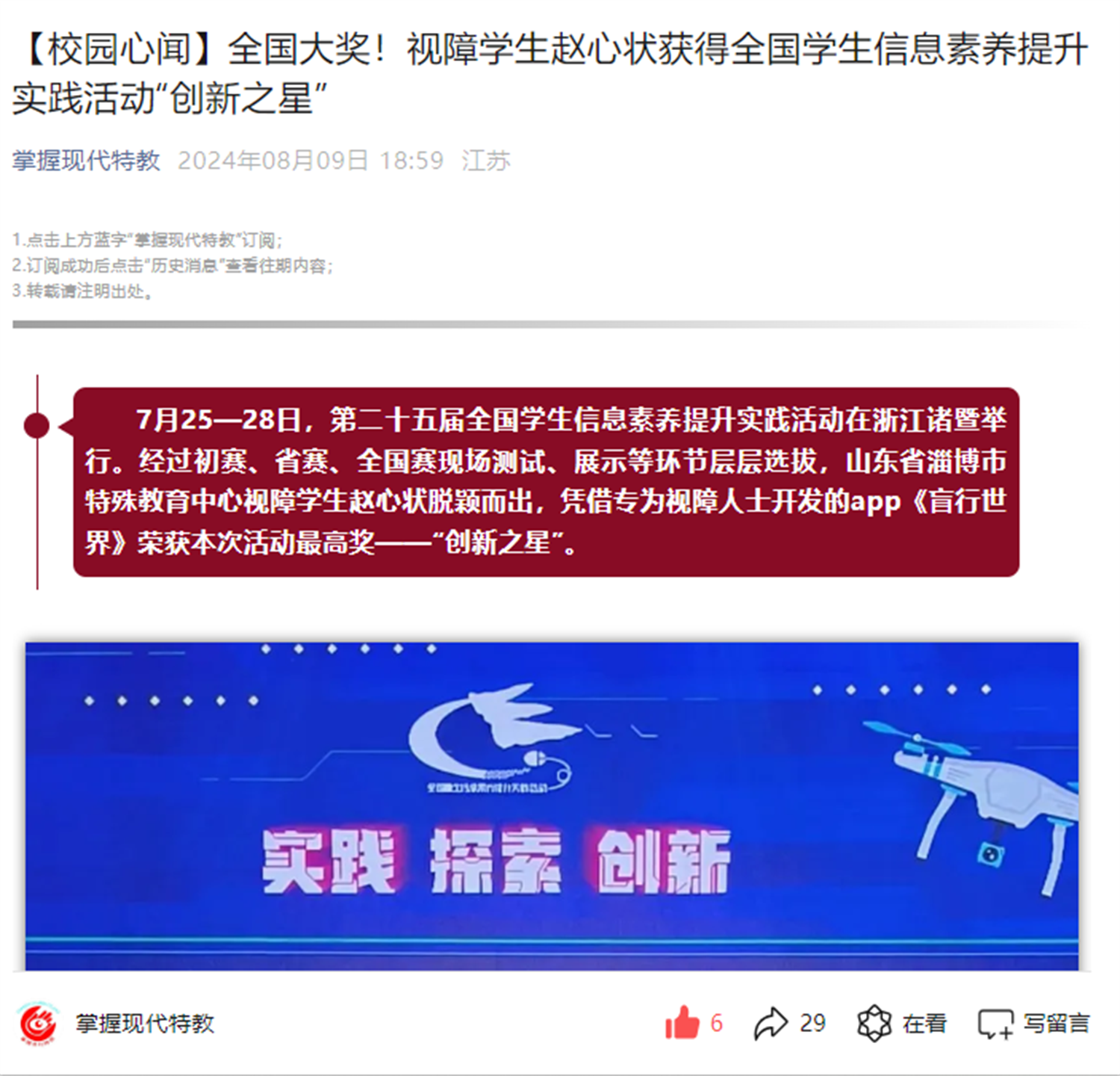 其中“掌握現(xiàn)代特教”是學(xué)術(shù)期刊《現(xiàn)代特殊教育》推出的官方微信公眾號(hào),是全國(guó)最具影響力的特殊教育類公眾號(hào)。報(bào)道中,不僅對(duì)趙心狀從前期準(zhǔn)備到中期訓(xùn)練,再到最終摘得“創(chuàng)新之星”及成長(zhǎng)之路進(jìn)行了回顧介紹,更對(duì)他作為唯一沖進(jìn)決賽的視障學(xué)生,并結(jié)合自身經(jīng)驗(yàn),為視障人士開發(fā)的輔助生活軟件《盲行世界》APP給與了高度評(píng)價(jià)。“趙心狀同學(xué)展現(xiàn)出極強(qiáng)的創(chuàng)新能力和扎實(shí)的信息素養(yǎng),其摘得“創(chuàng)新之星”稱號(hào)向大眾展現(xiàn)了特殊學(xué)生在創(chuàng)新型賽事中的能力和潛力,將激勵(lì)更多特殊學(xué)生投身探索信息技術(shù)的實(shí)踐中去。”