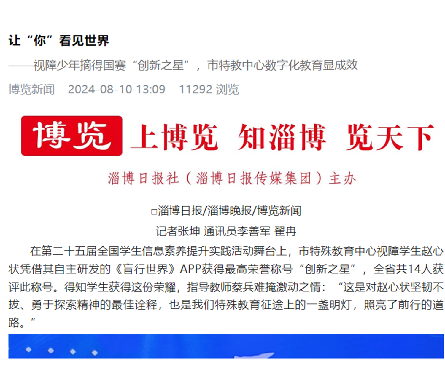 近日,在第二十五屆全國(guó)學(xué)生信息素養(yǎng)提升實(shí)踐活動(dòng)中,淄博市特教中心視障學(xué)生趙心狀憑借其自主研發(fā)的《盲行世界》APP,榮獲全國(guó)“創(chuàng)新之星”。此消息引發(fā)國(guó)內(nèi)眾多媒體密切關(guān)注。