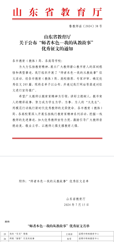 近日,山東省教育廳公布了“師者本色-我的從教故事”征文活動獲獎名單,淄博市特教中心教師的作品脫穎而出,榮獲佳績。