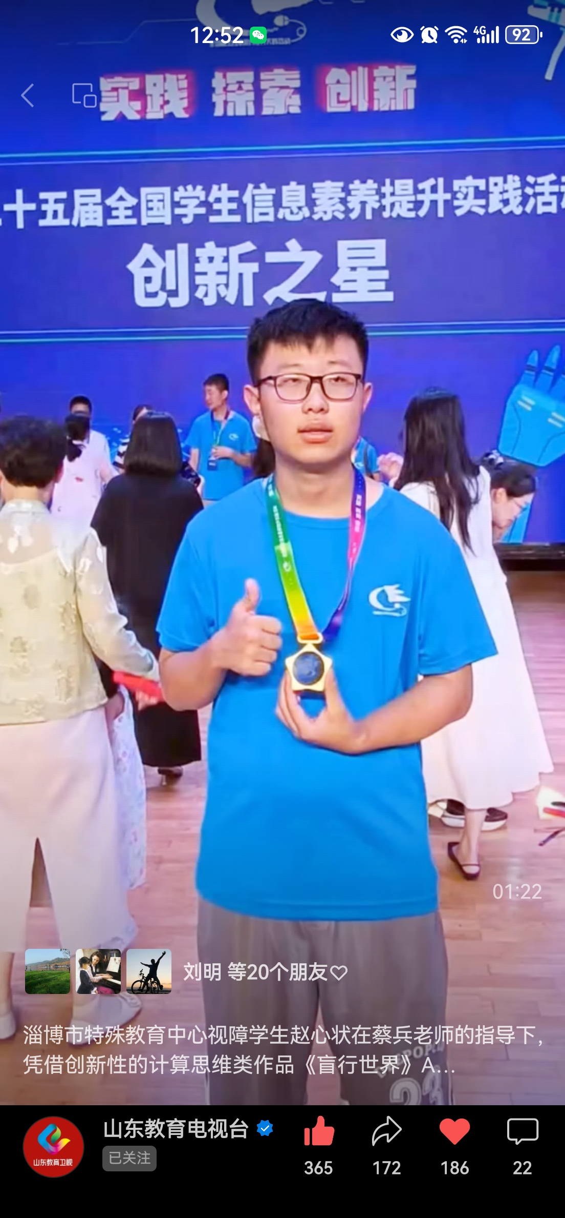 近日,在第二十五屆全國(guó)學(xué)生信息素養(yǎng)提升實(shí)踐活動(dòng)中,淄博市特教中心視障學(xué)生趙心狀憑借其自主研發(fā)的《盲行世界》APP,榮獲全國(guó)“創(chuàng)新之星”。此消息引發(fā)國(guó)內(nèi)眾多媒體密切關(guān)注。