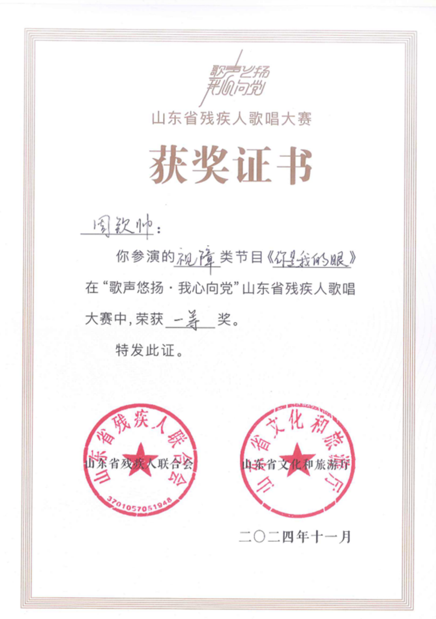嘹亮之音詮釋著生命堅毅,星光閃耀綻放出人生精彩。此前,憑借深厚的音樂功底和真摯的情感表達(dá),周俊篪、周欽帥兩兄妹在眾多參賽選手中脫穎而出,以淄博市視障類特等獎的成績成功晉級省賽,并再次以真情與實力獲得了評委認(rèn)可,成績公布后,不僅受邀赴濟(jì)南參加頒獎儀式,還作為優(yōu)秀節(jié)目代表進(jìn)行了現(xiàn)場展演。