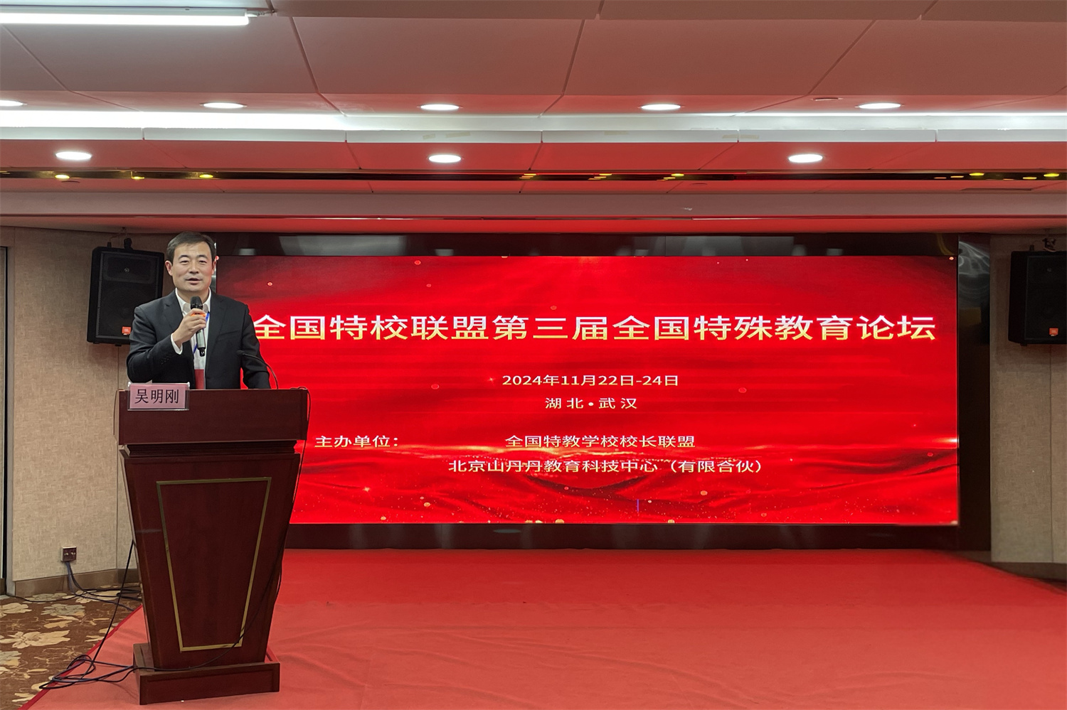 ?2024年11月23至24日,全國特殊教育學(xué)校聯(lián)盟第三屆特殊教育論壇在湖北武漢順利召開。來自全國教育、民政、殘聯(lián)系統(tǒng)及民辦機構(gòu)的特教教師、殘疾人服務(wù)人員和科研人員共130余人參加會議。聯(lián)盟理事長、淄博市特殊教育中心黨委書記吳明剛主持會議,副書記李善軍做典型發(fā)言。