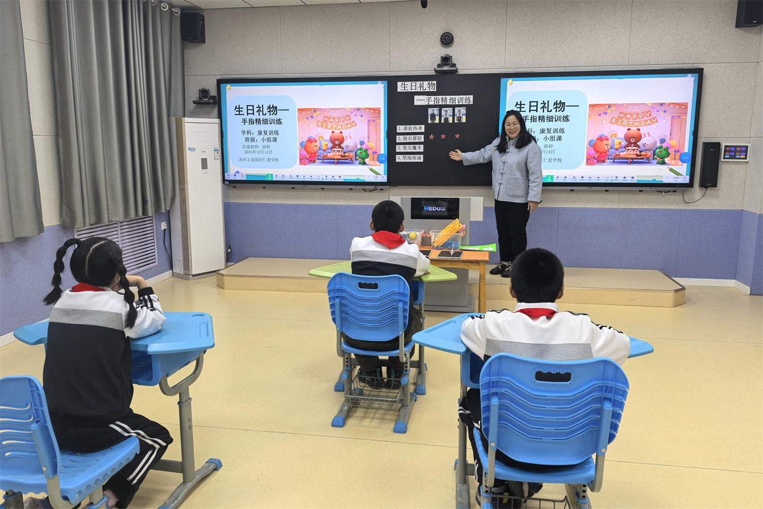 蘇州工業(yè)園區(qū)仁愛學(xué)校出示培智初二康復(fù)訓(xùn)練《生日禮物-手指精細(xì)訓(xùn)練》。教師遵循“教育與康復(fù)相結(jié)合”的原則,采用四步教學(xué)方法:利用視頻資源,創(chuàng)設(shè)《生日禮物》情境,將手指精細(xì)訓(xùn)練與書寫結(jié)合,通過“新特教智慧服務(wù)平臺(tái)”精準(zhǔn)評(píng)估,找出發(fā)展關(guān)鍵點(diǎn),巧妙使用學(xué)習(xí)機(jī),通過“指尖冒險(xiǎn)”和“筆尖魔術(shù)”游戲訓(xùn)練學(xué)生的手指力量、抓握能力和手腕穩(wěn)定訓(xùn)練,提高學(xué)生的手指精細(xì)能力。