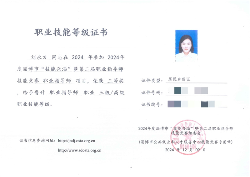 近日,淄博特教中心劉永方老師順利拿到職業(yè)指導(dǎo)師三級/高級職業(yè)技能等級證書。