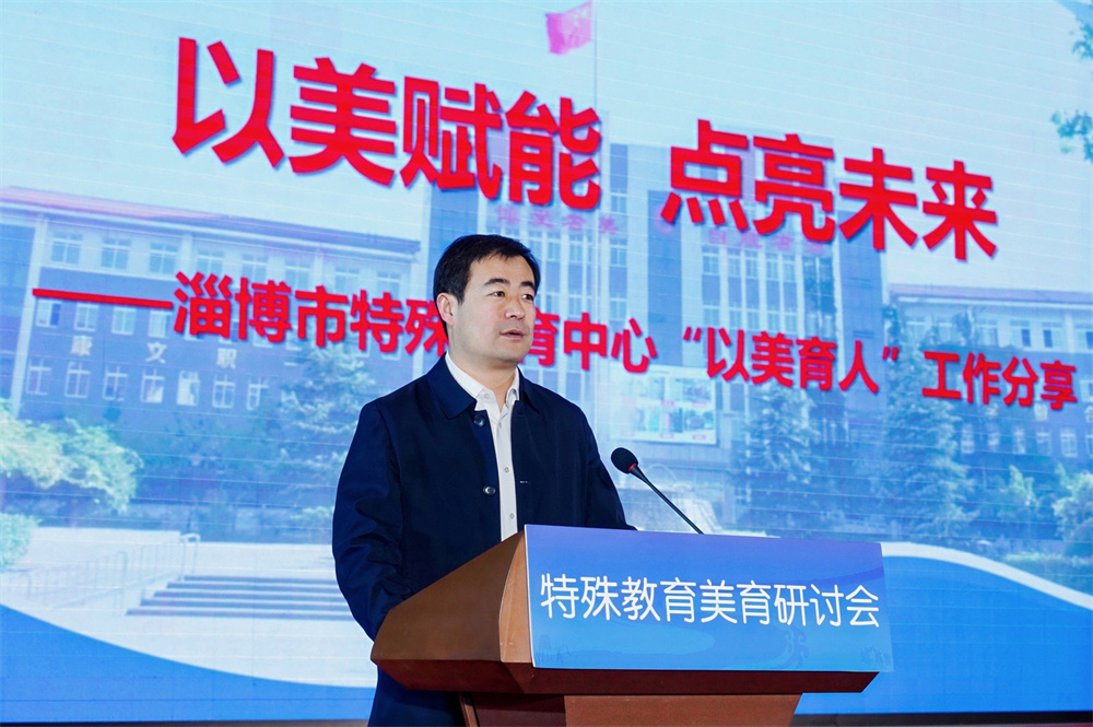 研討會上,學(xué)校被確立為首批“特殊教育美育實(shí)踐基地”。吳明剛以《美育賦能 點(diǎn)亮未來》為主題,從美育課程、美育資源、美育平臺、美育品牌等方面,向全國特教同仁分享了“以美育人”工作創(chuàng)新實(shí)踐的“淄特經(jīng)驗(yàn)”和“淄特成效”,贏得了與會專家和同行的高度贊譽(yù)。