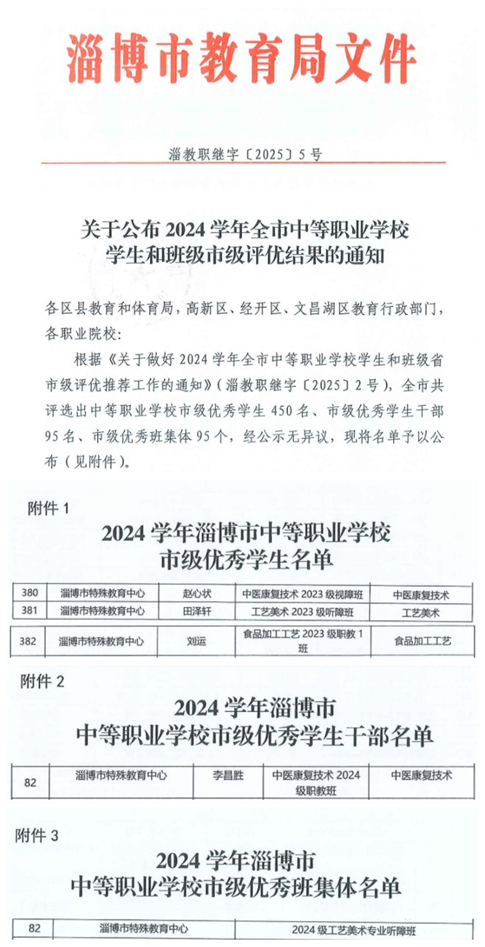 ?近日,淄博市教育局發(fā)布《關(guān)于公布2024學(xué)年全市中等職業(yè)學(xué)校學(xué)生和班級市級評優(yōu)結(jié)果的通知》,淄博市特教中心趙心狀、田澤軒、劉運(yùn)3名同學(xué)獲得“市級優(yōu)秀學(xué)生”稱號,李昌勝獲得“市級優(yōu)秀學(xué)生干部”稱號,周艷春老師帶領(lǐng)的2024級工藝美術(shù)專業(yè)聽障班獲得“市級優(yōu)秀班集體”榮譽(yù)稱號。